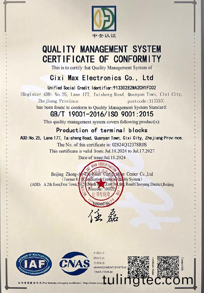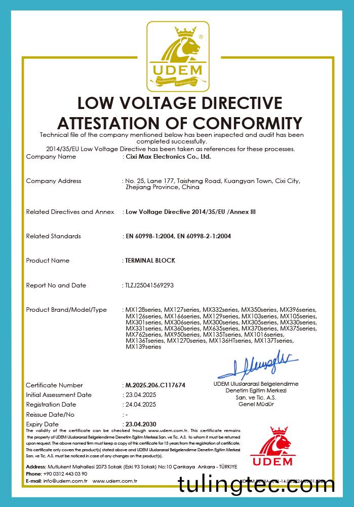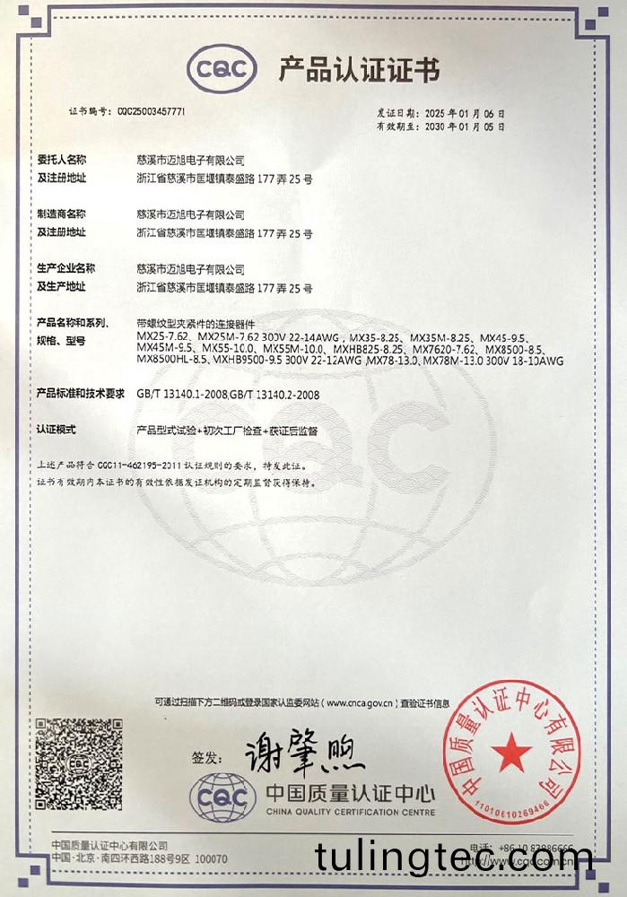 PCB式接線耑子(zi)已通(tong)過(guo)CQC、UL、TUV、CE等國際安槼(gui)認(ren)證(zheng),通過(guo)多種電(dian)氣(qi)連(lian)接技(ji)術滿(man)足客戶(hu)訊(xun)號(hao)、電力等(deng)傳輸需求。