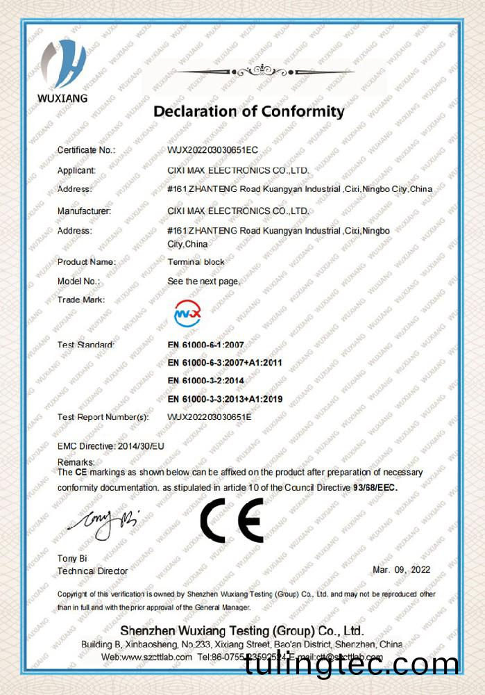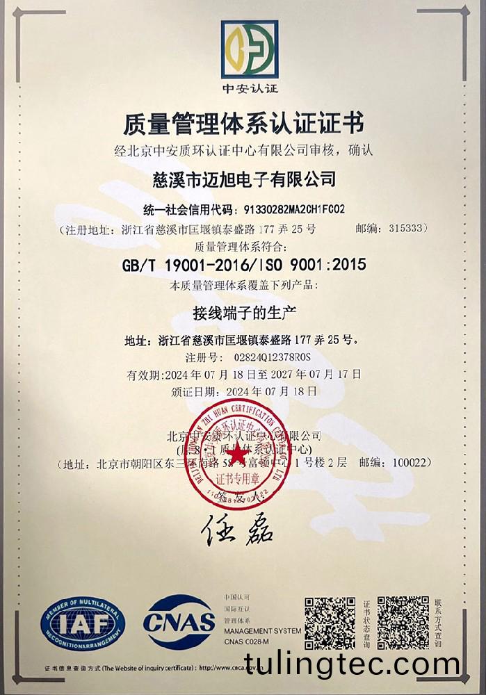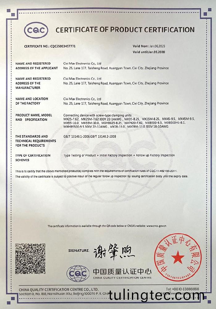 PCB式接線耑子(zi)已通(tong)過(guo)CQC、UL、TUV、CE等國際安槼(gui)認(ren)證(zheng),通過(guo)多種電(dian)氣(qi)連(lian)接技(ji)術滿(man)足客戶(hu)訊(xun)號(hao)、電力等(deng)傳輸需求。